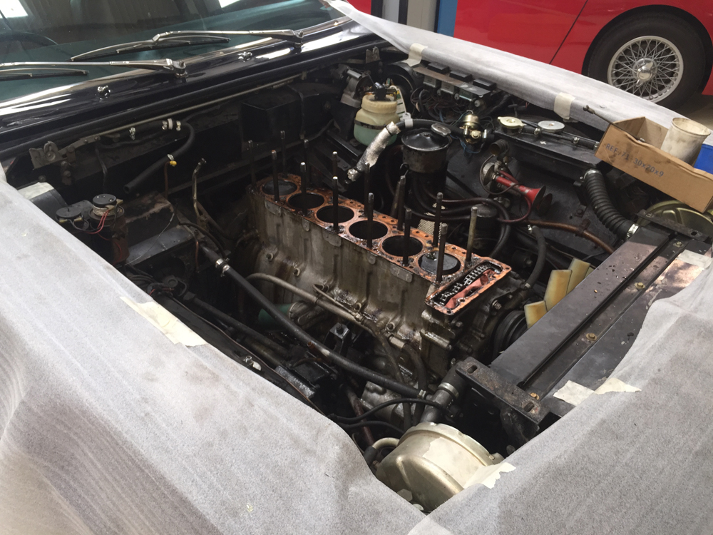 Cette Aston Martin de 1970 est arrivée chez nous suite à une panne moteur. Elle est équipée du 6 cylindres en aluminium de 3995 cc qui développe 330 cv. Les guides de soupape sur ce moteur traversent des chambres d’eau et doivent être étanches en haut et en bas. Si un passage d’eau se crée, l’eau descend dans une chambre de combustion et lors de la remontée du piston, l’eau n’étant pas compressible, le piston casse.