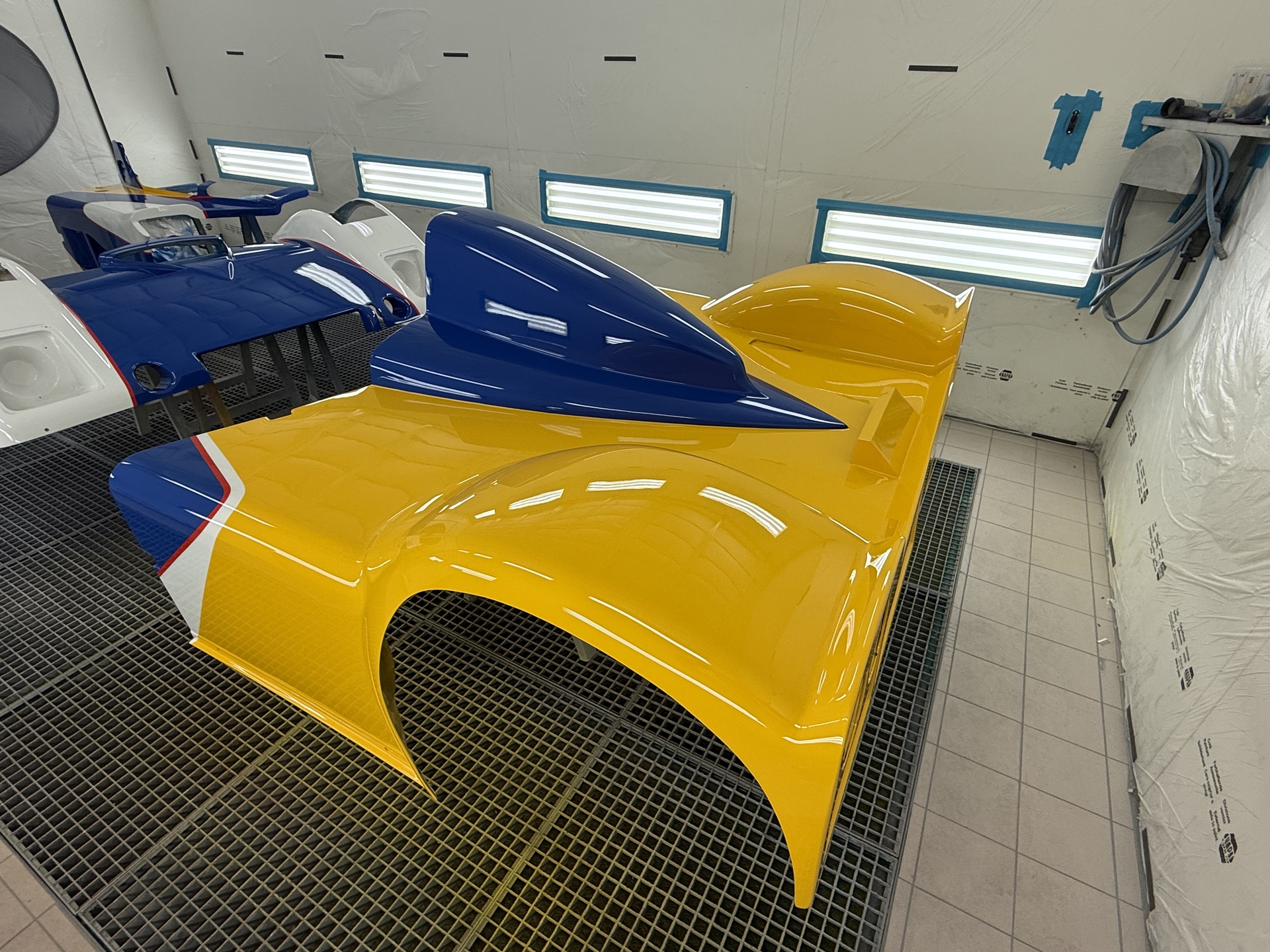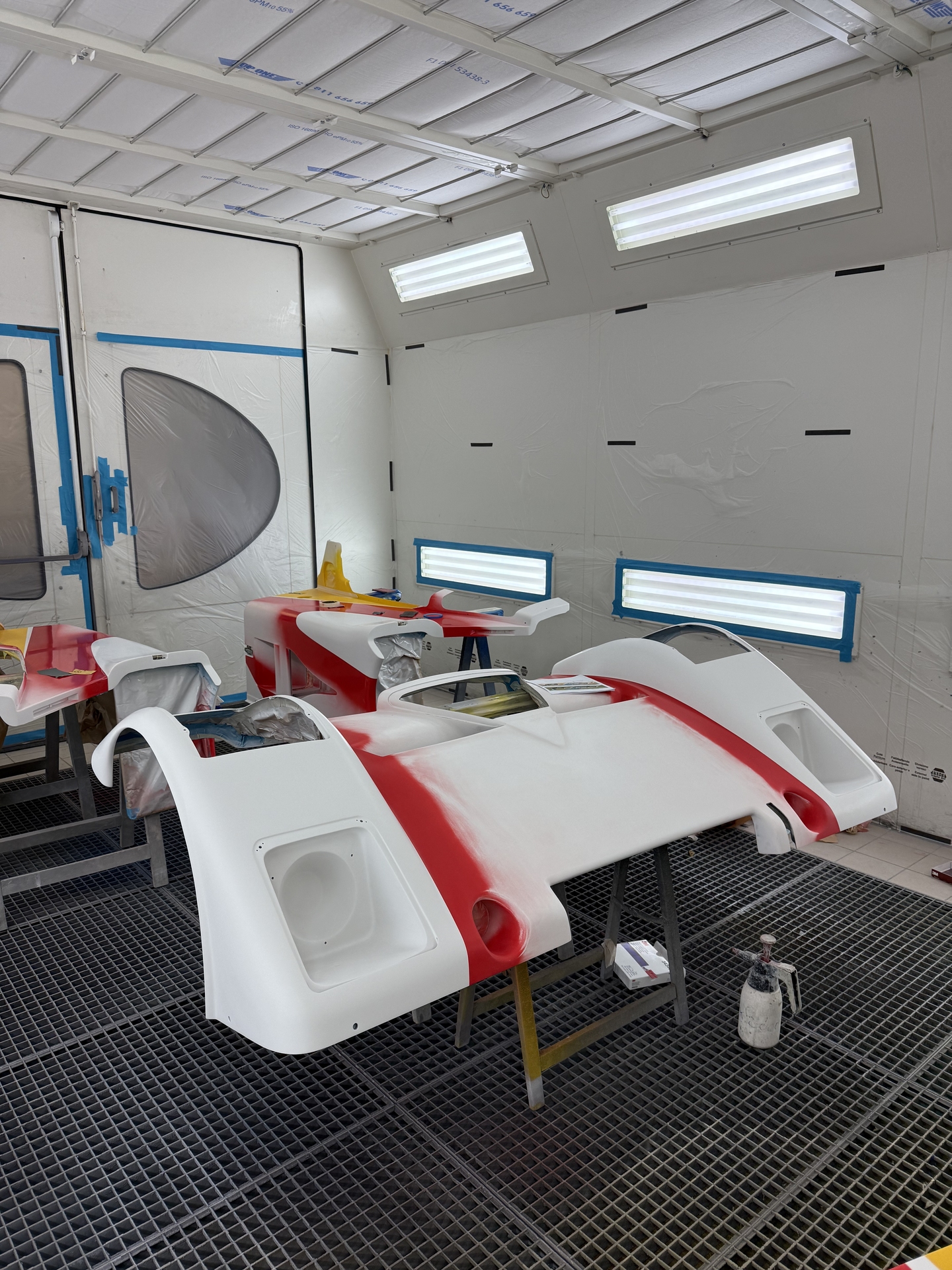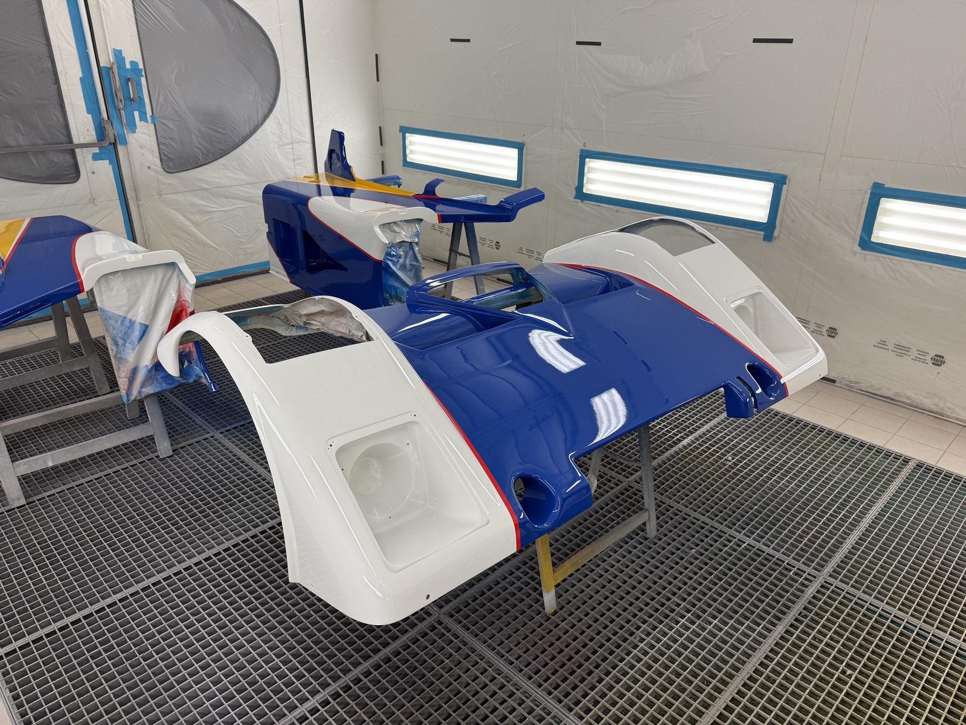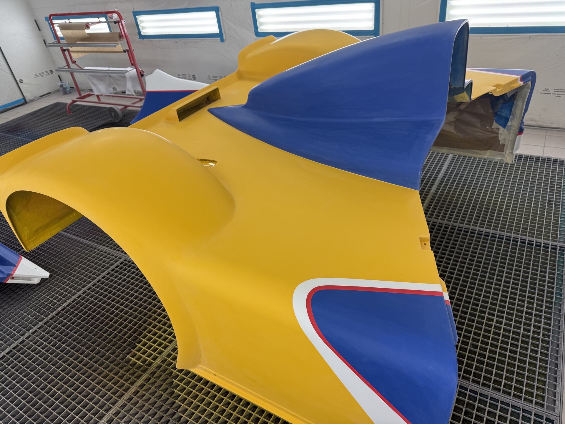 La carrosserie a représenté une part majeure du projet. Le capot avant a été entièrement reconstruit à partir d’une maquette visant à retrouver les bonnes symétries et la géométrie correcte, puis moulé afin de produire une pièce carbone propre, rigide et conforme à l’esprit d’origine. Le capot arrière et la zone de boîte à air ont été réalignés, et les jeux entre pontons et éléments de carrosserie repris avec précision. L’ensemble a été repeint dans la livrée d’époque telle que la voiture courait aux États-Unis, avec une qualité de finition visant à retrouver une présence visuelle cohérente et “juste”.