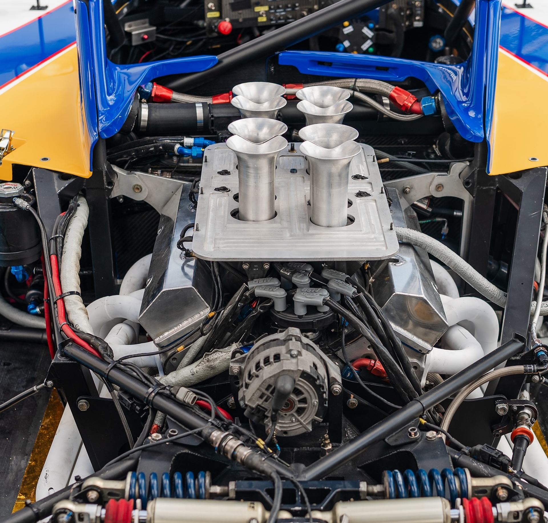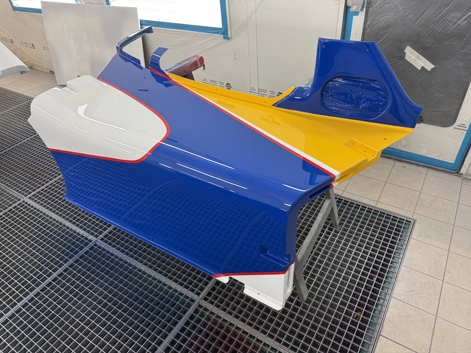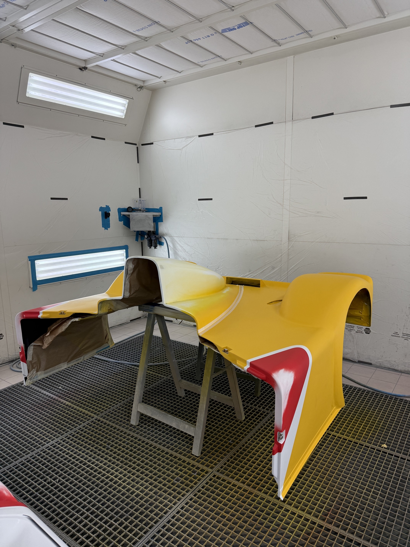 La carrosserie a représenté une part majeure du projet. Le capot avant a été entièrement reconstruit à partir d’une maquette visant à retrouver les bonnes symétries et la géométrie correcte, puis moulé afin de produire une pièce carbone propre, rigide et conforme à l’esprit d’origine. Le capot arrière et la zone de boîte à air ont été réalignés, et les jeux entre pontons et éléments de carrosserie repris avec précision. L’ensemble a été repeint dans la livrée d’époque telle que la voiture courait aux États-Unis, avec une qualité de finition visant à retrouver une présence visuelle cohérente et “juste”.