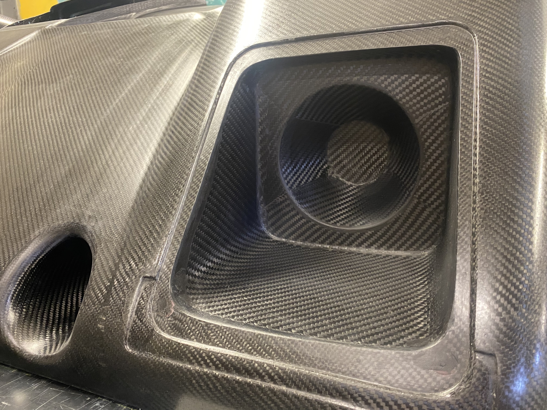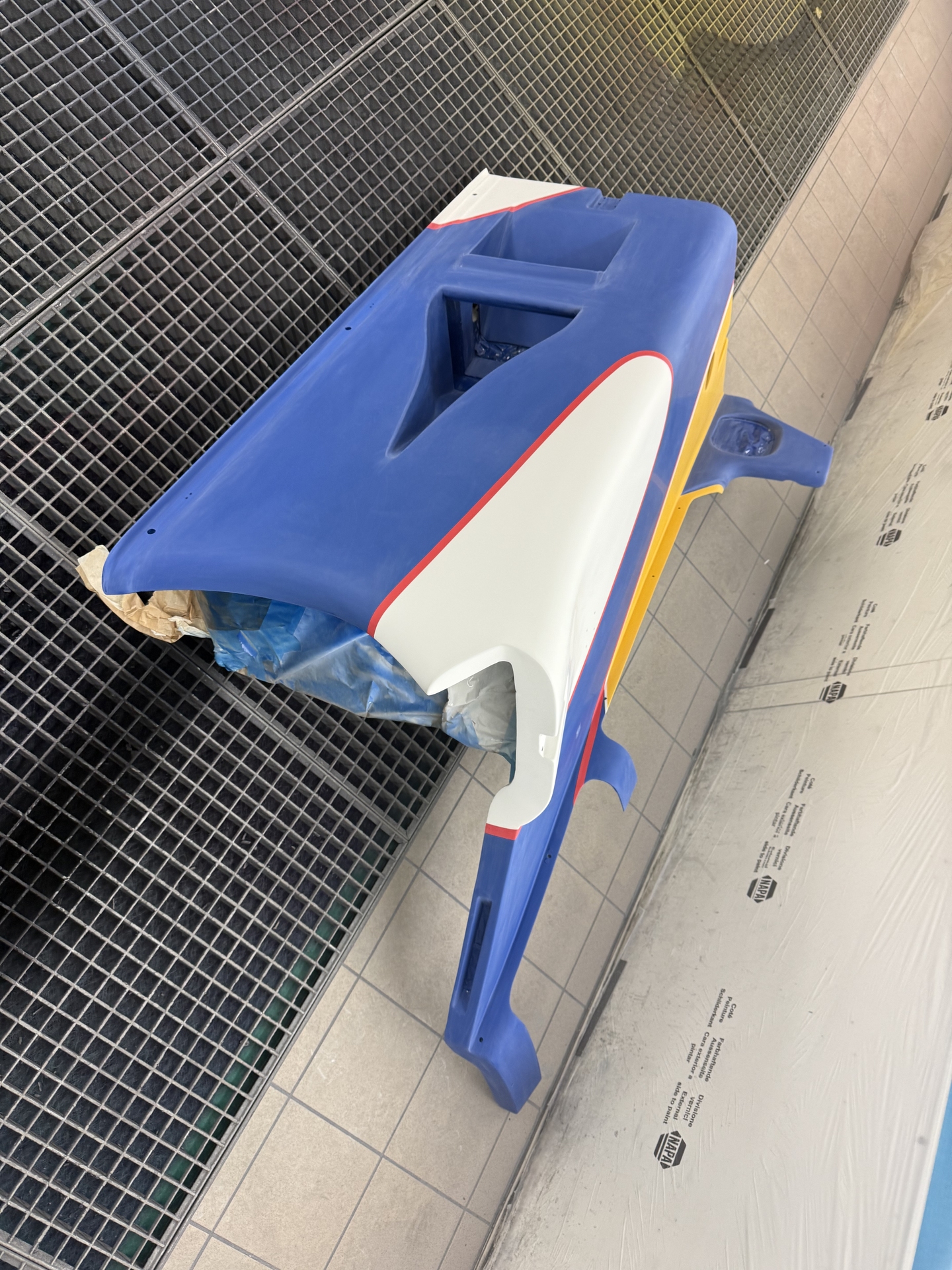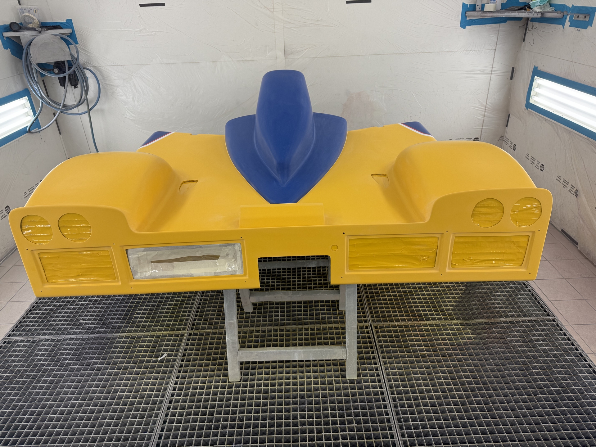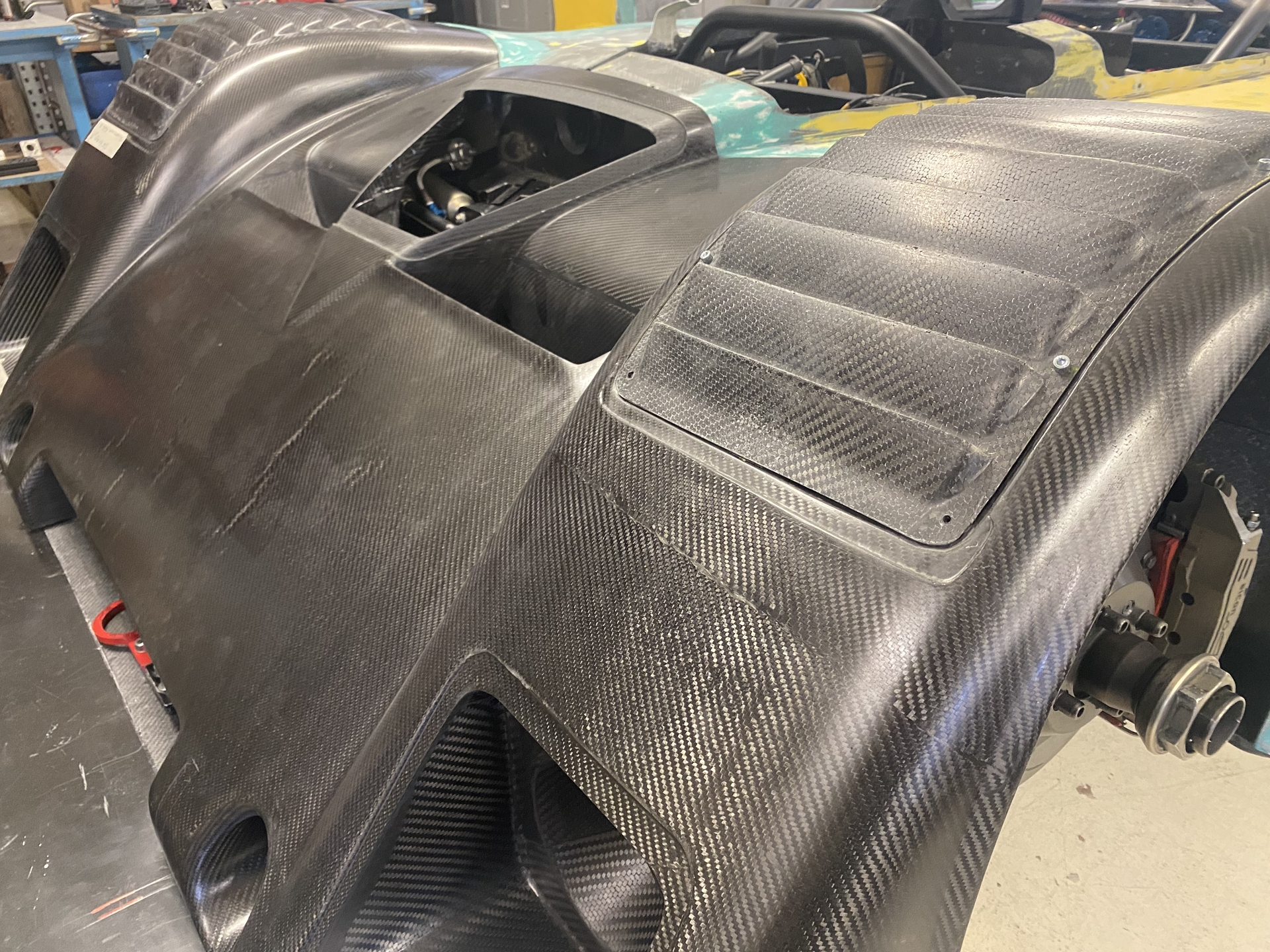 La carrosserie a représenté une part majeure du projet. Le capot avant a été entièrement reconstruit à partir d’une maquette visant à retrouver les bonnes symétries et la géométrie correcte, puis moulé afin de produire une pièce carbone propre, rigide et conforme à l’esprit d’origine. Le capot arrière et la zone de boîte à air ont été réalignés, et les jeux entre pontons et éléments de carrosserie repris avec précision. L’ensemble a été repeint dans la livrée d’époque telle que la voiture courait aux États-Unis, avec une qualité de finition visant à retrouver une présence visuelle cohérente et “juste”.