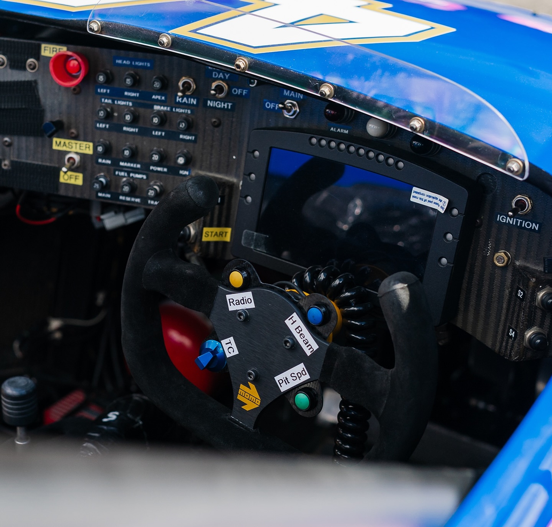 Après remontage, la voiture a bénéficié d’un travail complet de mise au point : réglages de suspension, hauteurs de caisse, poids aux roues, géométrie. La Riley & Scott Mk III a ensuite été installée sur banc de puissance pour un rodage et une validation, avec contrôle et calibration de l’ECU MoTeC. À ce stade, la voiture n’a pas encore repris la piste hors banc : la logique a été de livrer une base techniquement saine et parfaitement cohérente avant tout roulage intensif.