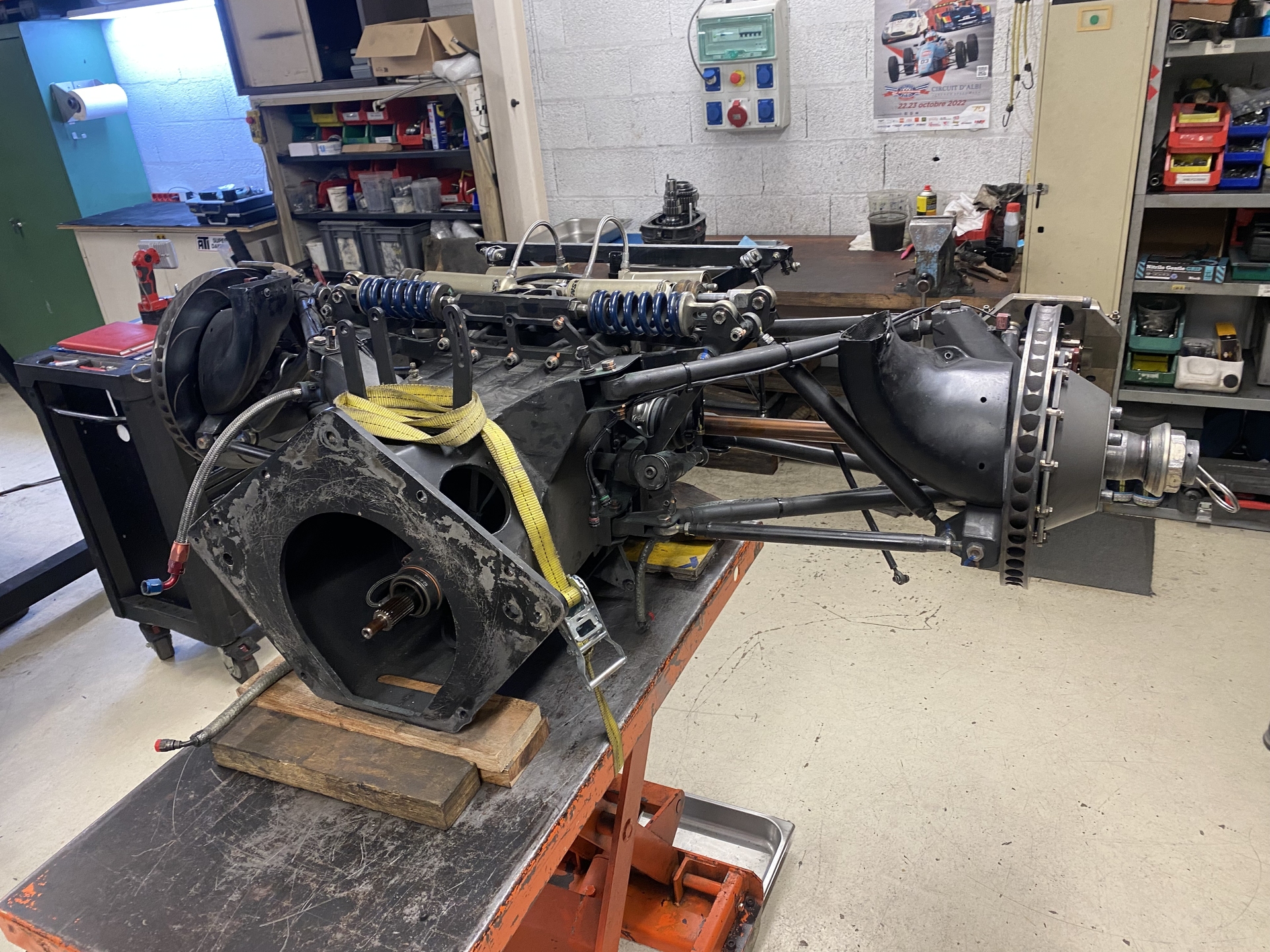 Les trains roulants ont été entièrement restaurés : triangles, porte-moyeux, barres de poussée, rotules et roulements. Un crack test complet a été mené sur l’ensemble des éléments sensibles (suspensions, porte-moyeux et pièces critiques) afin de garantir l’absence de fissures et de défauts structurels. Les amortisseurs ont été révisés, et l’ensemble a été remonté avec une attention particulière portée aux jeux, aux alignements et à la cohérence globale de la cinématique.