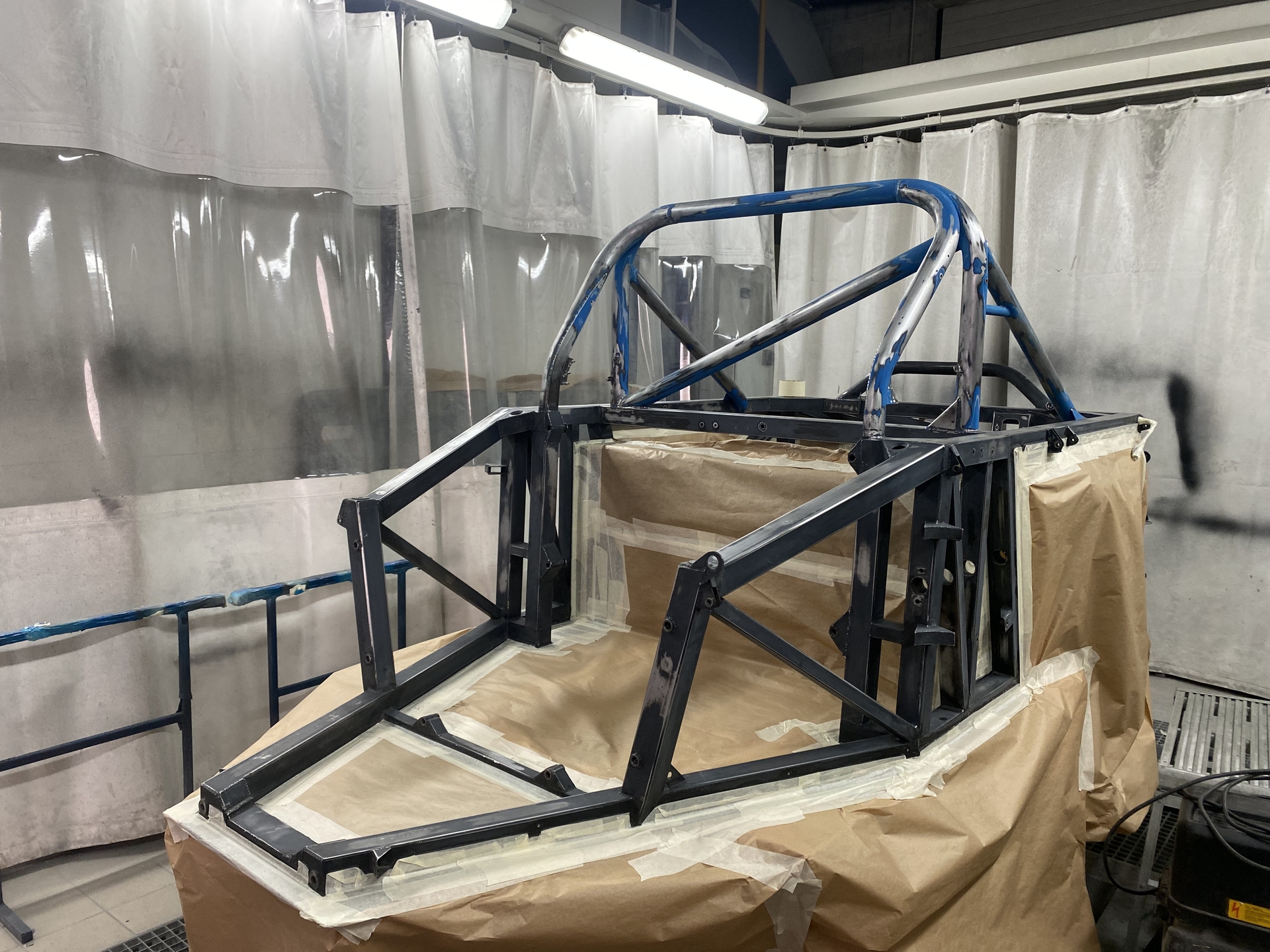 Le châssis multitubulaire acier, associé à des panneaux carbone collés à la colle structurelle, a été contrôlé sur marbre afin de valider la géométrie et l’intégrité des points d’ancrage. Après décapage complet, les zones sensibles ont été inspectées, certaines soudures reprises, et des supports/platines de fixation de triangles renforcés ou remplacés lorsque nécessaire. Les interventions ont été réalisées avec une exigence de qualité compatible avec un retour en course, notamment via des reprises de soudure TIG là où cela s’imposait. Le châssis a ensuite été remis en peinture dans sa teinte d’origine.